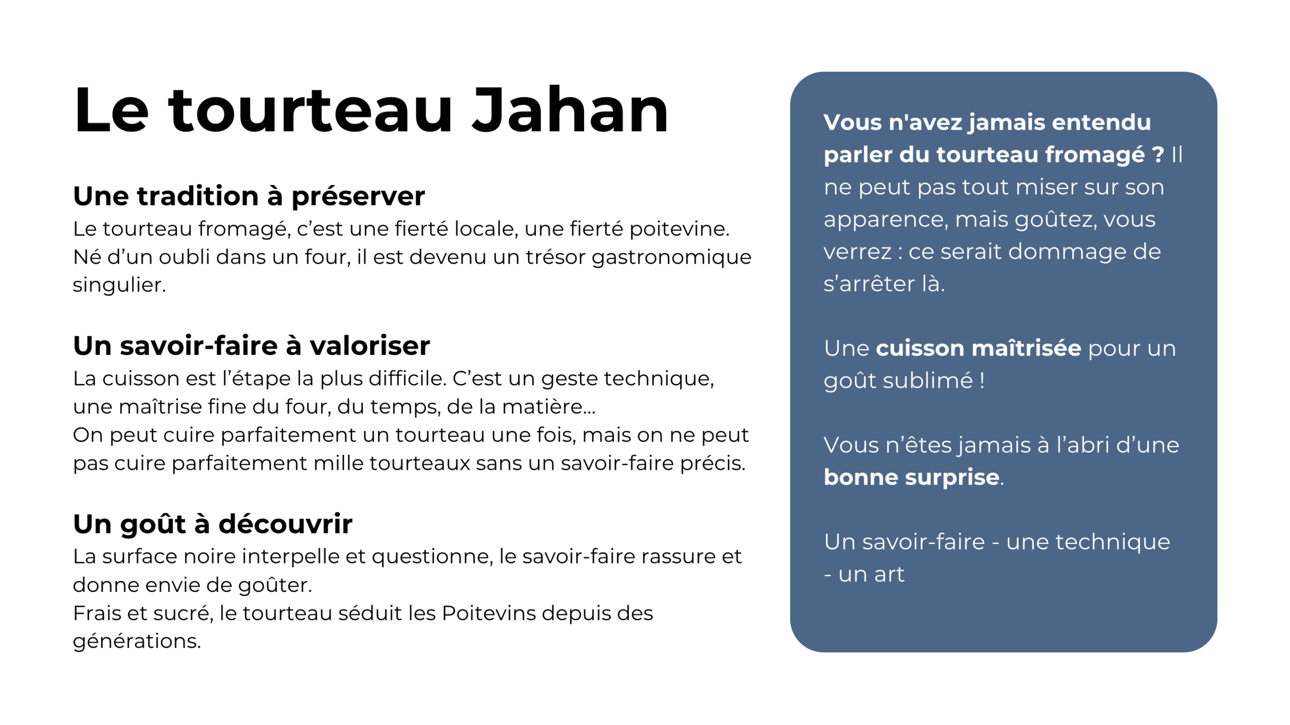 Jahan est une fromagerie artisanale implantée dans le Poitou, héritière d’un savoir-faire local transmis depuis plusieurs générations. Sa spécialité emblématique : le tourteau fromagé, un gâteau régional aussi singulier que déroutant, qui peine à dépasser les frontières du Poitou-Charentes.